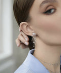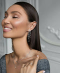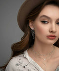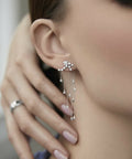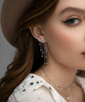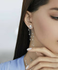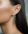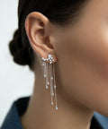 الأقراط - سترات "Starfall". أقراط ستارفال عبارة عن 18 نجمة متصلة بأرق سلاسل فضية سمكها 0.85 ملم. شحمة الأذن مزينة بزهرة القرنفل - كوكبة مرصعة بالزركون الأبيض المكعب. طول المنتج: 7 سم، طول الكوكبة: 1.5 سم