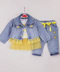 مجموعة ملابس الدنيم اللطيفة للفتيات مكونة من 3 قطع. سترة من الدنيم مزينة بالدانتيل، وسروال من الدنيم مزين بالتطريز، وقميص مطبوع مع كشكشة من التول.
