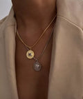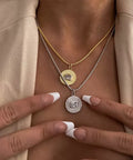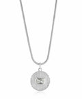 قلادة قلادة Le Signe باللون الفضي من Luv AJ عبارة عن قلادة فضية من الروديوم تتميز بقلادة قرصية مع خطوط مزخرفة مع إطار مرصع بالكريستال المستطيل الشفاف على سلسلة حبل. يبلغ مقاس هذه القلادة 40.64 سم مع وصلة تمديد 5.08 سم وتم تشطيبها بلمعان عالي اللمعان. قم بإقران قلادة Le Signe المتدلية مع الخاتم المطابق من Luv AJ للحصول على مظهر متماسك!