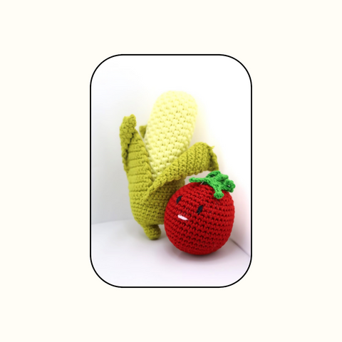 *HANDMADE: The handmade crotchet fruit and vegetable dolls (corn, tomato'') made in France by skilled knitters.*MATERIAL & SAFETY: The fruit and vegetable crochet dolls are made with organic yarn and milk cotton.*CHILDS DEVELOPMENT: This crochet fruits and vegetables have beautiful colors, and this collection will assist them learn different colors and types of fruits even as they play.*SAFETY: These beautiful crotchets are ecofriendly and not toxic to children even when put in the mouth. It can be washed manually and in the machine without changing its form* CARE: For best results, wash with nontoxic detergents and air dry.*GIFTS: These crotchet toys are perfect gifts for birthday, children’s day, baptism, Christmas and as a motivation for good academic performances.