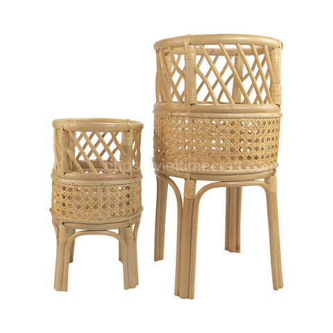 The Doro Planter Stand Set of 2, in natural color and made from polished rattan, is a stylish and functional addition to any space. Here’s a detailed overview: Key Features: Materials: Polished Rattan: Offers a natural, textured look with a smooth finish, combining durability and elegance. Design: Dimensions: Small Stand: DIA 27 cm x 46 cm height Large Stand: DIA 32 cm x 65 cm height Natural Color: Enhances the rattan’s natural grain and texture, providing a warm, organic appearance. Style: The combination of natural rattan and a clean design makes these stands suitable for a variety of decor styles, from contemporary to rustic. Uses: Indoor Plants: Ideal for displaying houseplants, adding height and elegance to your plant arrangement. Outdoor Spaces: Can be used in covered patios or garden areas to enhance the display of outdoor plants. Decorative Accents: Useful for adding a stylish touch to corners or entryways with decorative elements. Styling Tips: Modern Minimalism: Pair with sleek, contemporary furnishings and a neutral color palette to highlight the natural texture of the rattan. Bohemian Vibe: Combine with other woven or textured items and colorful plants for a cozy, eclectic look. Rustic Charm: Use with wooden furniture and natural elements to create a warm, inviting atmosphere. Tropical Style: Integrate with tropical decor elements like palm leaves and light colors for an island-inspired look. Care Instructions: Cleaning: Wipe with a soft, damp cloth to remove dust and dirt. Avoid soaking or using harsh chemicals. Protection: Keep away from excessive moisture and direct sunlight to prevent damage and fading. Maintenance: Regularly check for any signs of wear or damage and handle with care to maintain its appearance and functionality. DIY Enhancement Ideas: Personalization: Add decorative pots or planters to suit your style and the plants you’re displaying. Custom Arrangements: Use the stands in various settings, such as grouped together or spread out in different rooms. Seasonal Decor: Incorporate seasonal plants or decorations to adapt the stands to different times of the year. The Doro Planter Stand Set of 2 combines functionality with elegant design, making it a versatile and stylish addition to your home or garden.
