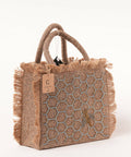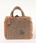 Boost your mundane look with this jute tote sling bag with a dexterously handcrafted honey comb with a BEE pattern. The bag comes with an inside pocket, and a golden detachable metallic chain that adds to its adds to its functionality.