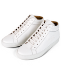 Stefano Borella Monet Mid-Top Dress Sneaker: A standout bestseller, the Monet sneaker combines casual functionality with refined Italian craftsmanship. Made from premium full-grain calfskin leather, its hand-painted finish and sleek SB-embossed logo add timeless elegance to its design. The lightweight rubber outsole ensures grip and all-day comfort, while its versatile style effortlessly pairs with both casual and formal outfits. With replaceable insoles and a luxurious finish, the Monet sneaker is a perfect blend of sophistication and practicality, making it a wardrobe essential.The Monet Mid Top - White