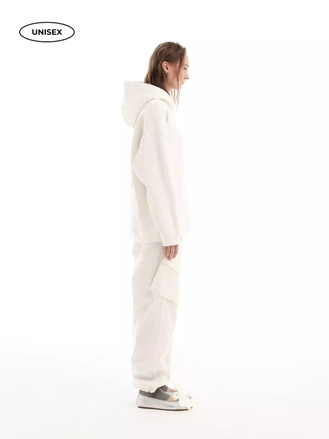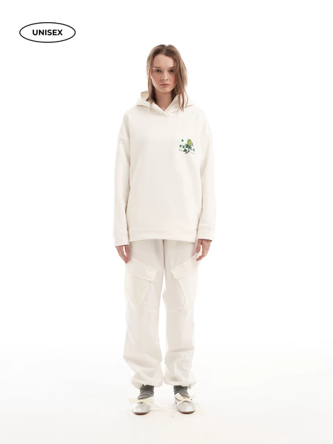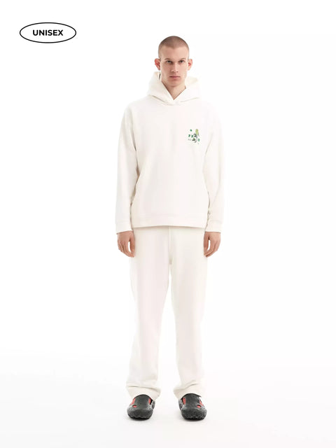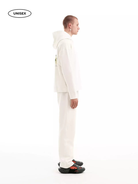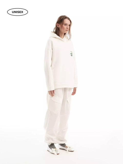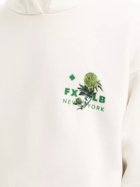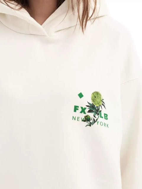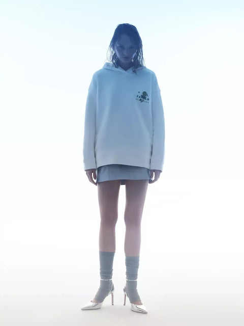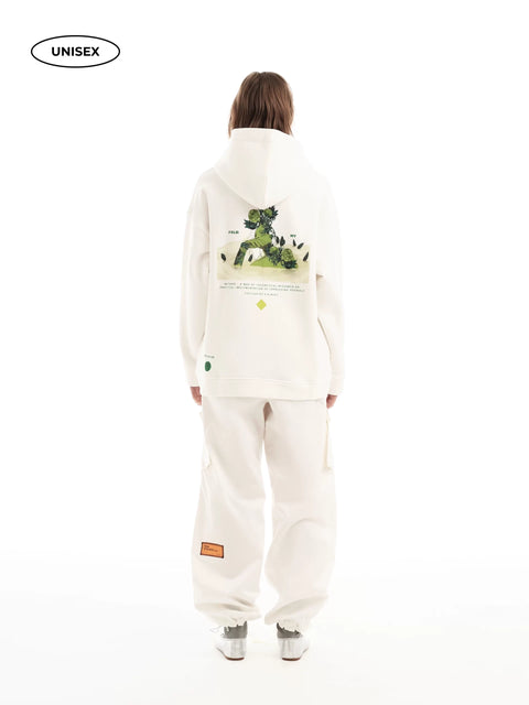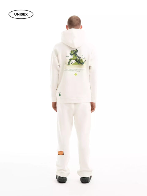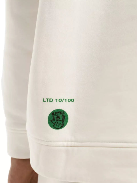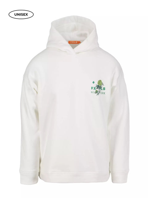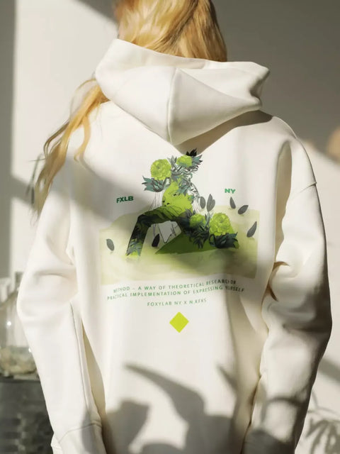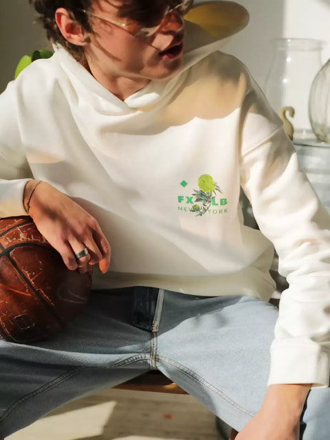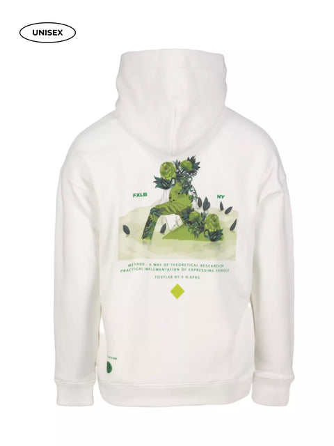 GREEN METHOD is a drop created in collaboration with N. KFKS, a talented artist whose life experience in Asia and the desire to explore the human being’s internal world inspired the motif of this collection. The laid back hoodie is made from a soft white fleece and has two pockets on the sides, the garment is decorated with print and unique number.