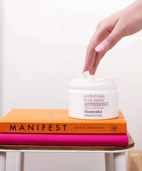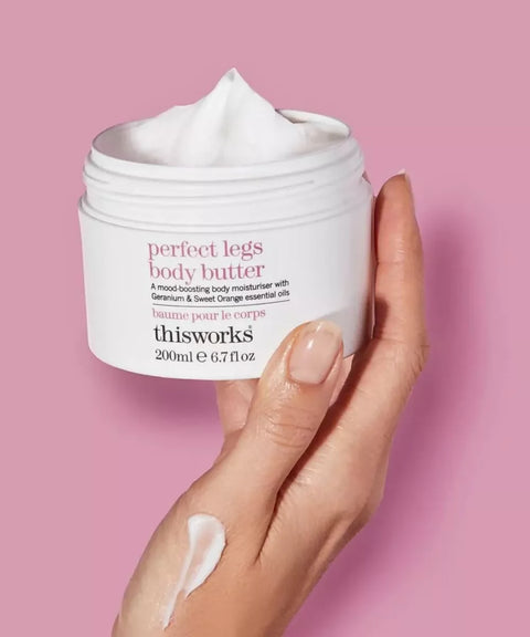 This 98% natural, deeply moisturizing body butter is infused with mood-boosting Geranium and Sweet Orange essential oils, to nourish your skin and put a spring in your step. Featuring Hemp extract to help support the skin's microbiome, moisturising Hyaluronic Acid to add a dose of hydration, and nourishing Shea Butter and uplifting essential oils. Use as part of your daily wellness routine to nourish the skin and boost your mood. Vegan and Cruelty-Free.200mlWhy We Love ThisGood body butter is a post-shower must-have and this one smells like heaven. Beyond the refreshing fragrance, it helps restore the overall health of your skin while supporting its natural microbiome. What's the microbiome, you ask? It's a layer of the skin made up of trillions of live microorganisms that protects the skin from outside aggressors. Keep your skin healthy and moisturized to help your microbiome to thrive. What's more, the perfect legs body butter can be used during and after pregnancy (and whilst breast feeding).How to UseBefore showering, massage perfect legs natural scrub to exfoliate and restore skin on the legs and body.Once dry, scoop the body butter into your hand and inhale the mood-boosting fragrance of Geranium & Sweet Orange essential oils.Massage into legs and body in an upwards direction to smooth skin, lift your spirits and set you up for the day ahead.About the BrandCreated by a former Beauty Director for Vogue, This Works is more than just a brand name: it's a promise. Every single product is validated by a panel of real people and at least 70% must agree that 'this works' prior to launch. Founder Kathy Phillips wanted clean skincare that cut out unnecessary chemicals without compromising on performance. As both a yoga teacher and beauty expert, Kathy understood the connection between lifestyle and skin health, creating intelligent, targeted solutions that optimize the skin's performance 24 hours a day, starting with a good nights sleep. Every product is made with a superblend of proven actives inspired by nature, botanical oils and therapeutic fragrances.