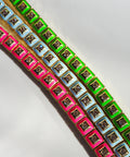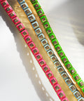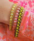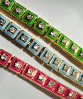 Punk stud pavé tennis bracelet featuring hot pink enamel trimBracelet is 7” long, studs are 4mmMade from Brass with CZ StonesPlated GoldMagnetic closureAlso available in Bright Green and Baby BlueBracelet is 100% nickel-free and cadmium-free