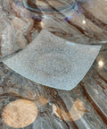 THE CENTRE PIECE OF THE "RIFLESSI" COLLECTION MEASURES 34 CM X 34 CM. IT IS MADE OF SHAPED GLASS. THE CRYSTAL PLATE IS MANUALLY COVERED WITH GLASS BEADS OF VARIOUS SIZES AND THEY ARE FUSED TOGETHER AT VERY HIGH TEMPERATURES IN ORDER TO CREATE A SINGLE PRODUCT OF GREAT VISUAL IMPACT. THIS SPECIAL COMBINATION COMES TO LIFE LIKE A DIAMOND WHEN ILLUMINATED. IN THIS VERSION THE CRYSTAL IS LEFT IN ITS NATURAL COLOUR TO ENHANCE ITS PURITY.
