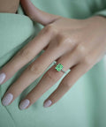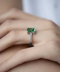 For the first time, emerald cut became known about 500 years ago and gained its popularity in versatile forms of the Art Deco period at the beginning of the 20th century. Despite the fact that it has less gloss than other types of facets, the wide and flat shape emphasizes the purity of the stone and its depth.In our collection, these rings are presented in several versions. Among 10 hues you will definitely find the perfect one for your image!The height is 9 mm.