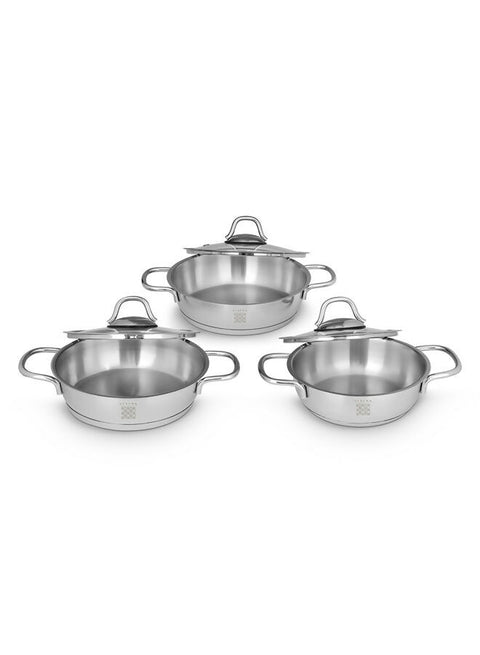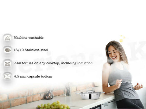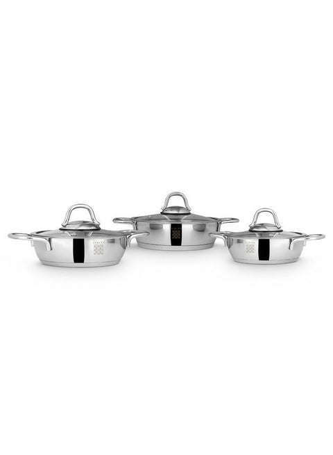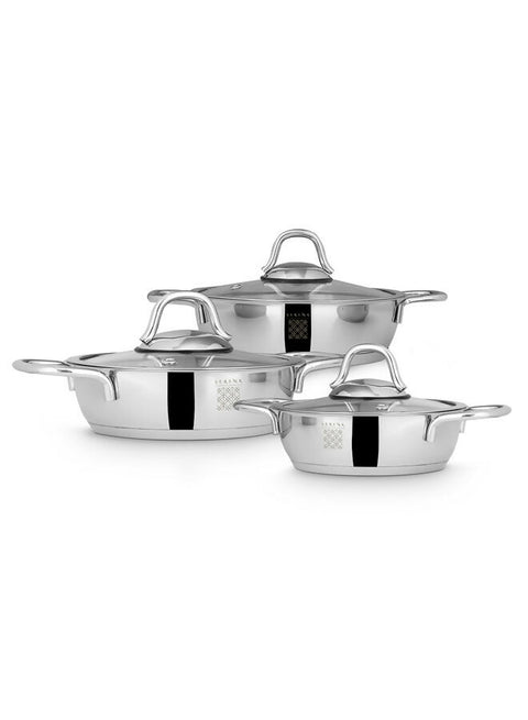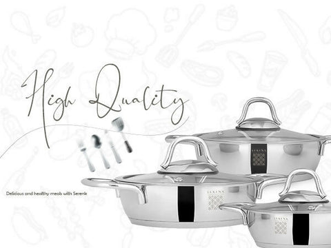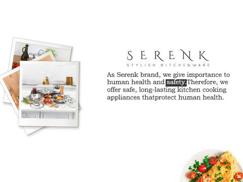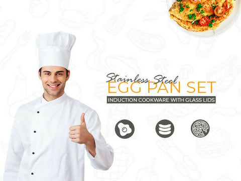 SERENK EGG PAN SET: Serenk egg pan is made from 18/10 stainless-steel which exceedingly resistant to scratches, staining and will maintain its performance for a lifetime. Besides being durable, stainless steel is healthy, does not contain any toxic material, and is suitable for contact with food.DIMENSIONS: 6 piece pan set includes 5", 6" and 7" omelette pan with tight-fitting glass lids. Please note: lids are counted as individual pieces. Tempered glass lids lock in true flavor and nutrients for tender, succulent dishes while the body-extension steel handles offer a safe and secure hold. CAPSULE BOTTOM PAN SET: This always pan has a flat cooking surface for efficient searing and sautéing. Extremely heat-responsive capsul bottom transfers heat and spreads it quickly and evenly, throughout the cookware, all the way to the rim.INDUCTION COOKWARE: Ideal for use on any cooktop, including induction.USE&CARE: Serenk pots and pans are dishwasher safe. Avoid using steel wool, steel scouring pads or harsh detergents. Stubborn food residue and stains can be removed with a nylon scrubbing pad and a fine-powdered cleanser.