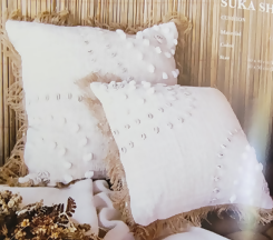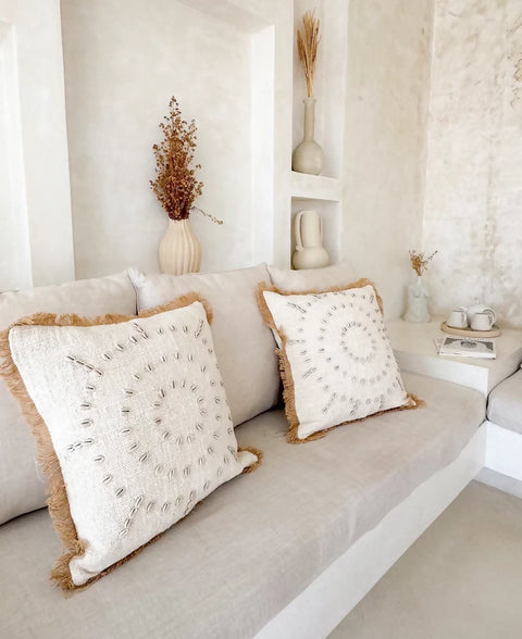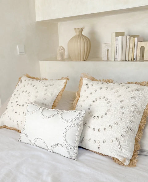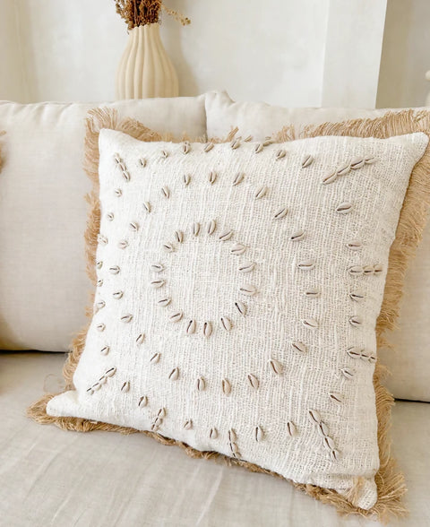 The Tassel & Shells Canvas Cushion Cover is a beautiful and unique home accessory that adds a touch of coastal charm and bohemian flair to any room. Here’s a detailed overview: Key Features: Dimensions: Size: 45 x 45 cm Material: Main Fabric: Linen, known for its durability, breathability, and natural texture. Decorative Elements: Tassels and shells, adding texture and a coastal, bohemian touch. Design: Style: The cushion cover features tassels and shells, creating an eye-catching and decorative look. Color: Typically natural or neutral tones, complementing a variety of decor styles. Uses: Decorative Cushion: Ideal for adding a decorative touch to sofas, chairs, or beds. Comfort: Provides added comfort and support when used as a throw pillow. Styling Tips: Coastal Decor: Complements coastal or beach-themed interiors with its natural elements. Boho Chic: Fits well with bohemian or eclectic interiors, adding texture and visual interest. Neutral Spaces: Adds a touch of texture and style to neutral or minimalist interiors without overwhelming the design. Care Instructions: Cleaning: Spot clean with a damp cloth. If necessary, hand wash gently and air dry. Avoid machine washing to protect the tassels and shells. Maintenance: Check periodically for any loose shells or tassels and reattach or secure them as needed. DIY Enhancement Ideas: Mix and Match: Pair with other cushions in various sizes and colors to create a layered and cozy look. Seasonal Touch: Incorporate with seasonal decor for a fresh and updated look throughout the year. The Tassel & Shells Canvas Cushion Cover is a versatile and stylish accessory that enhances the aesthetic appeal of any living space with its unique combination of natural materials and decorative elements.