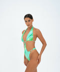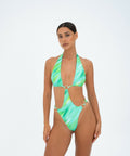 Get ready to set your summer look on fire with this tie back one piece with ring detail. Made from ultra luxurious sustainable fabric, features Charlotte Elize’s unmistakable custom print of green stripes. The newest collection “Splash”, draws inspiration from art icons Andy Warhol and Jackson Pollock. The custom prints represent paint brush strokes. Like with all art, this Charlotte Elize one piece make sure it stands out. HighlightsGreen Stripe - all over printFully reversibleStretch-designRemovable care labelMade in BaliOne PieceRear tie fasteningCheeky cut Tonal ring detailsFull cupCompositionSustainable fabric with trace technology 14% Elastine / spandex 86% Nylon Care instructionsHand wash; Do not tumble dry;Do not dry clean; Do not iron;Do not bleach;